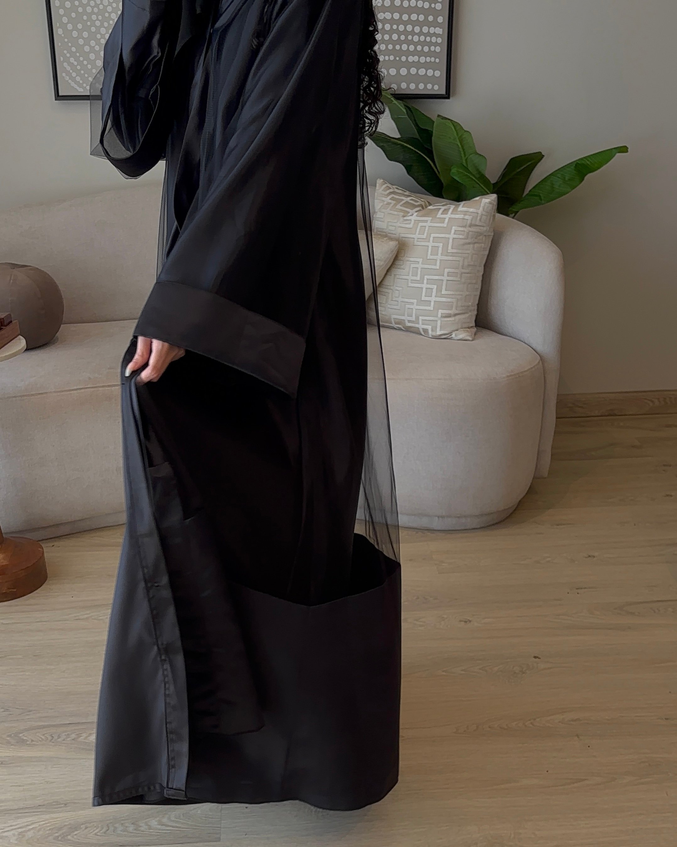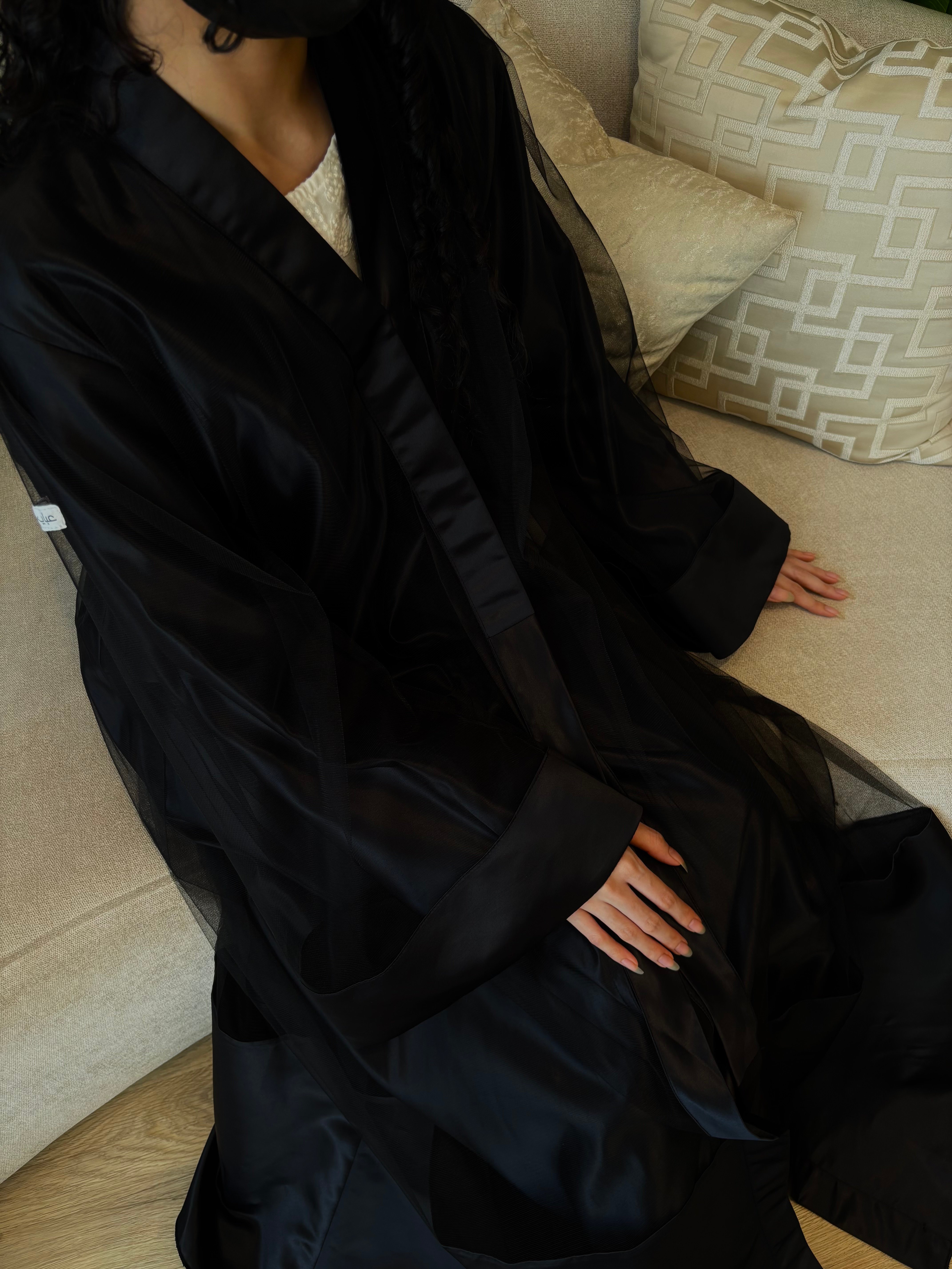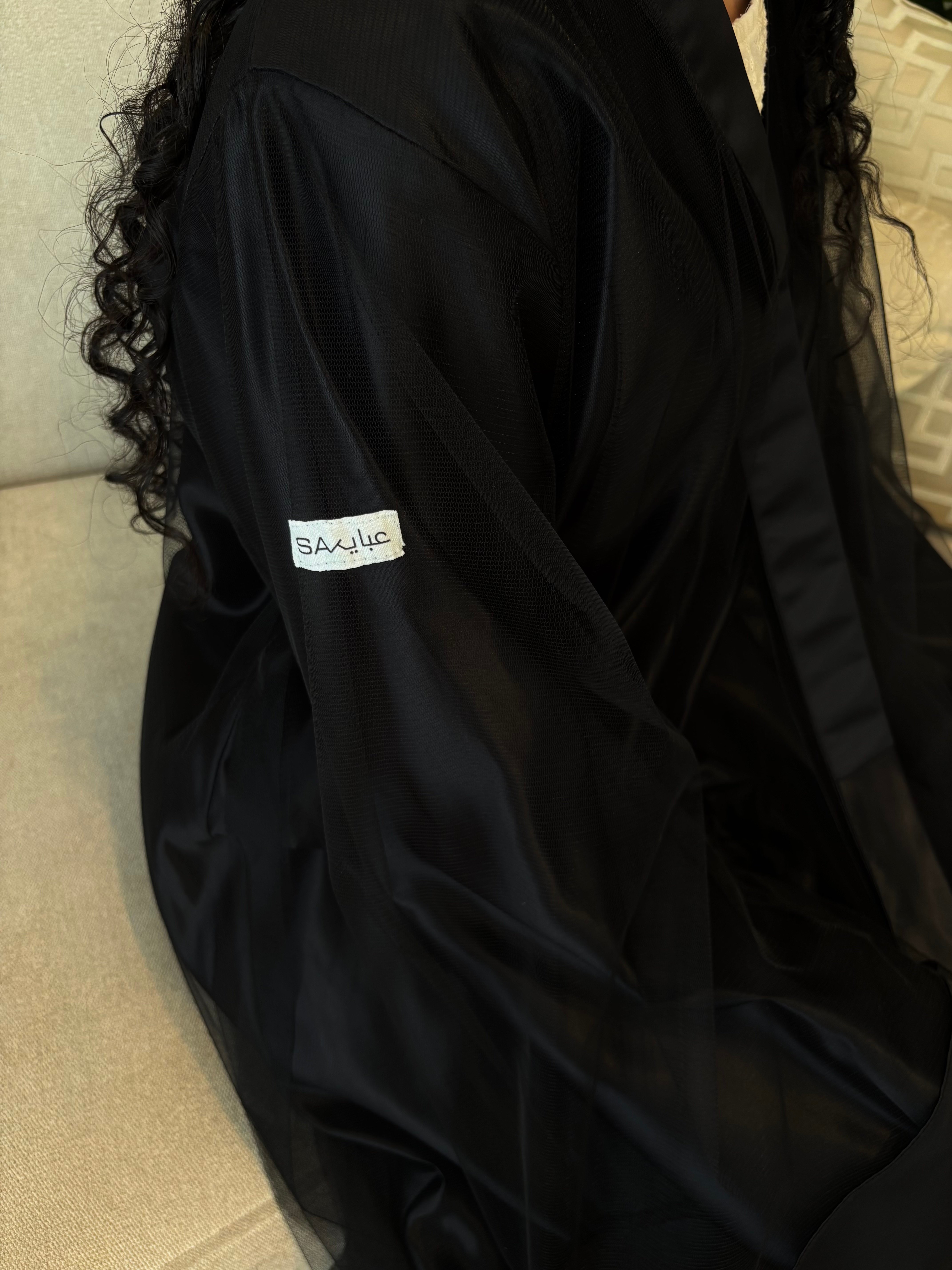 نوع القماش: قطعتين تل أسود فرنسي + تفتة واقف أسود