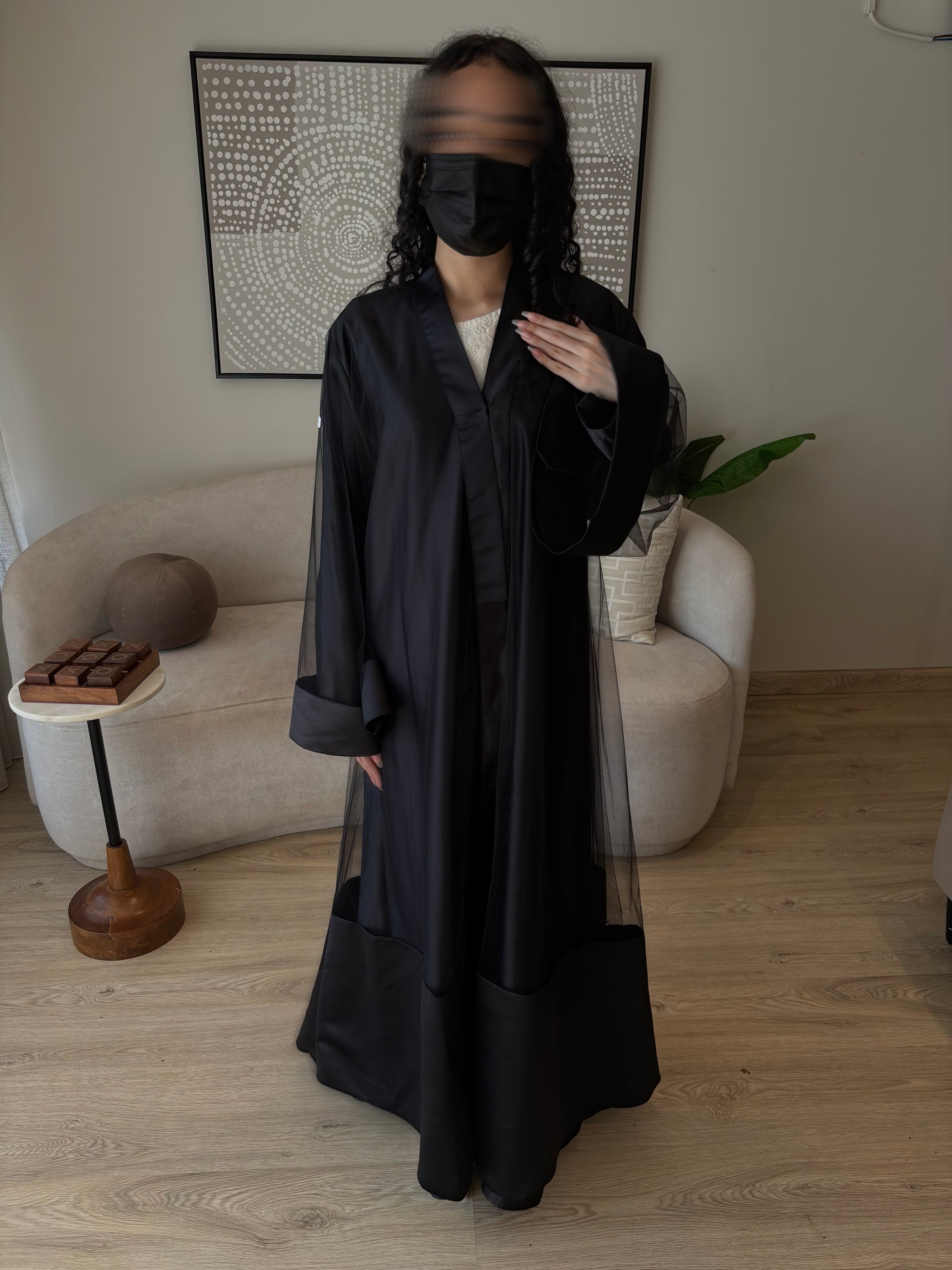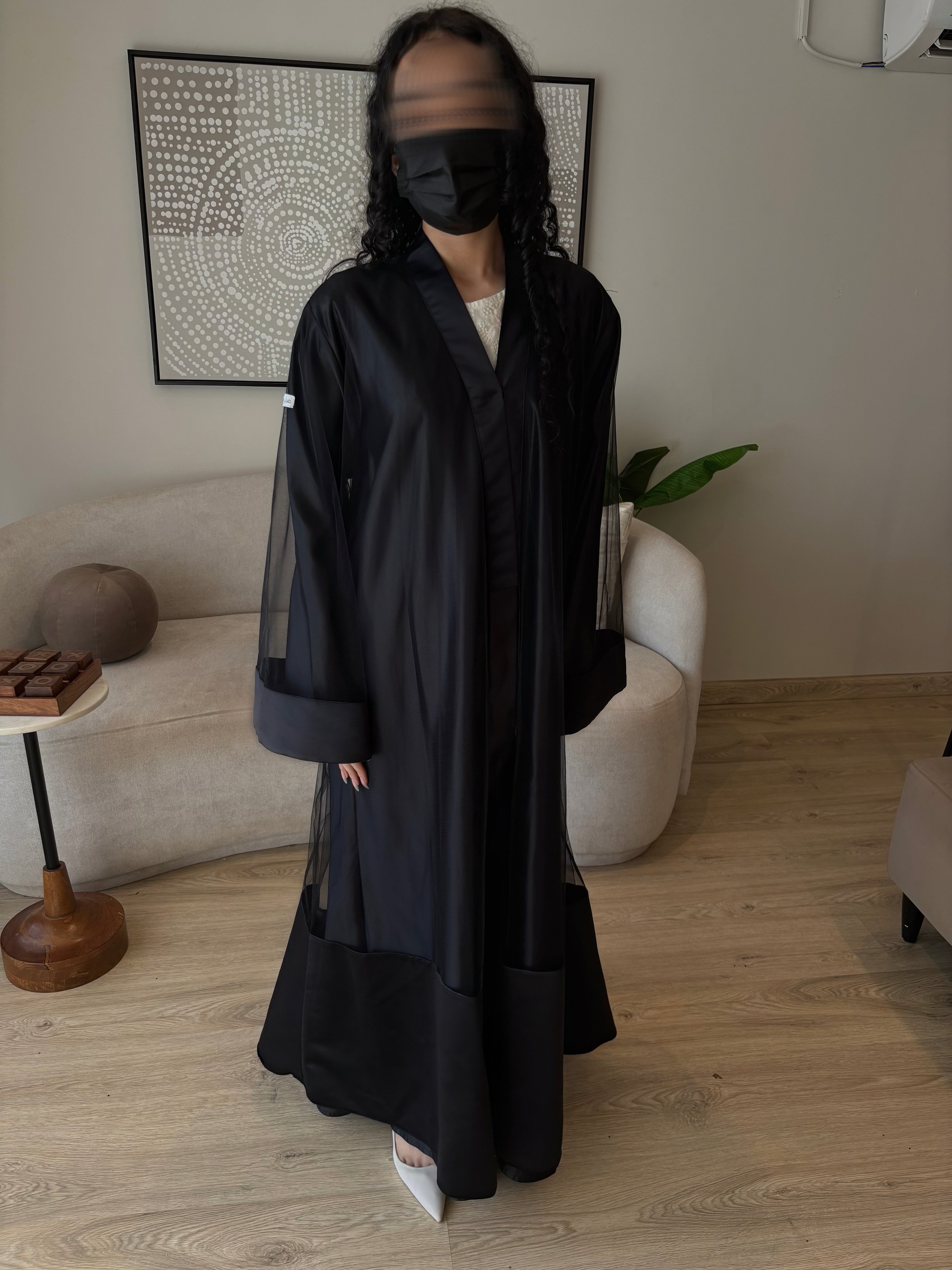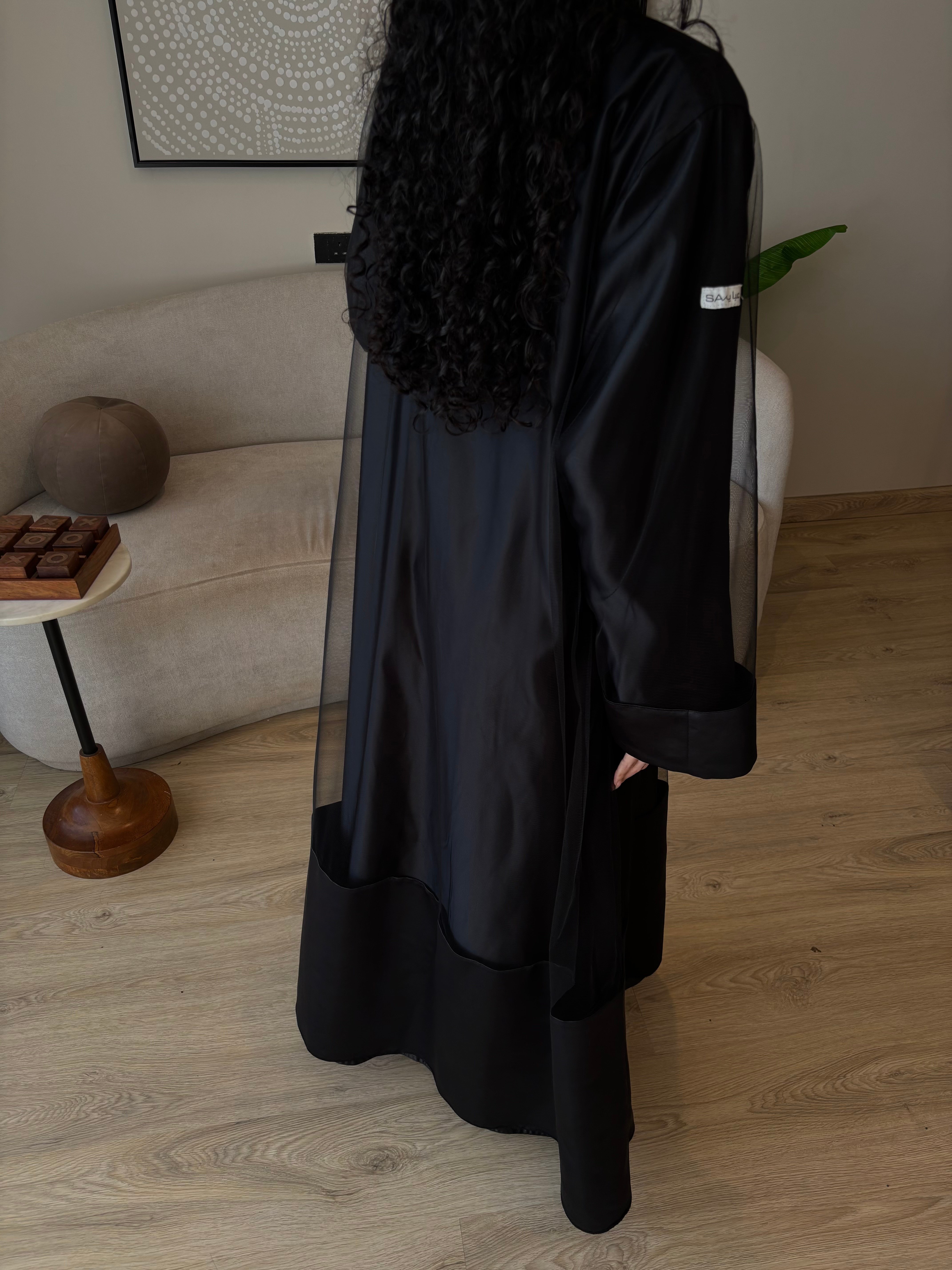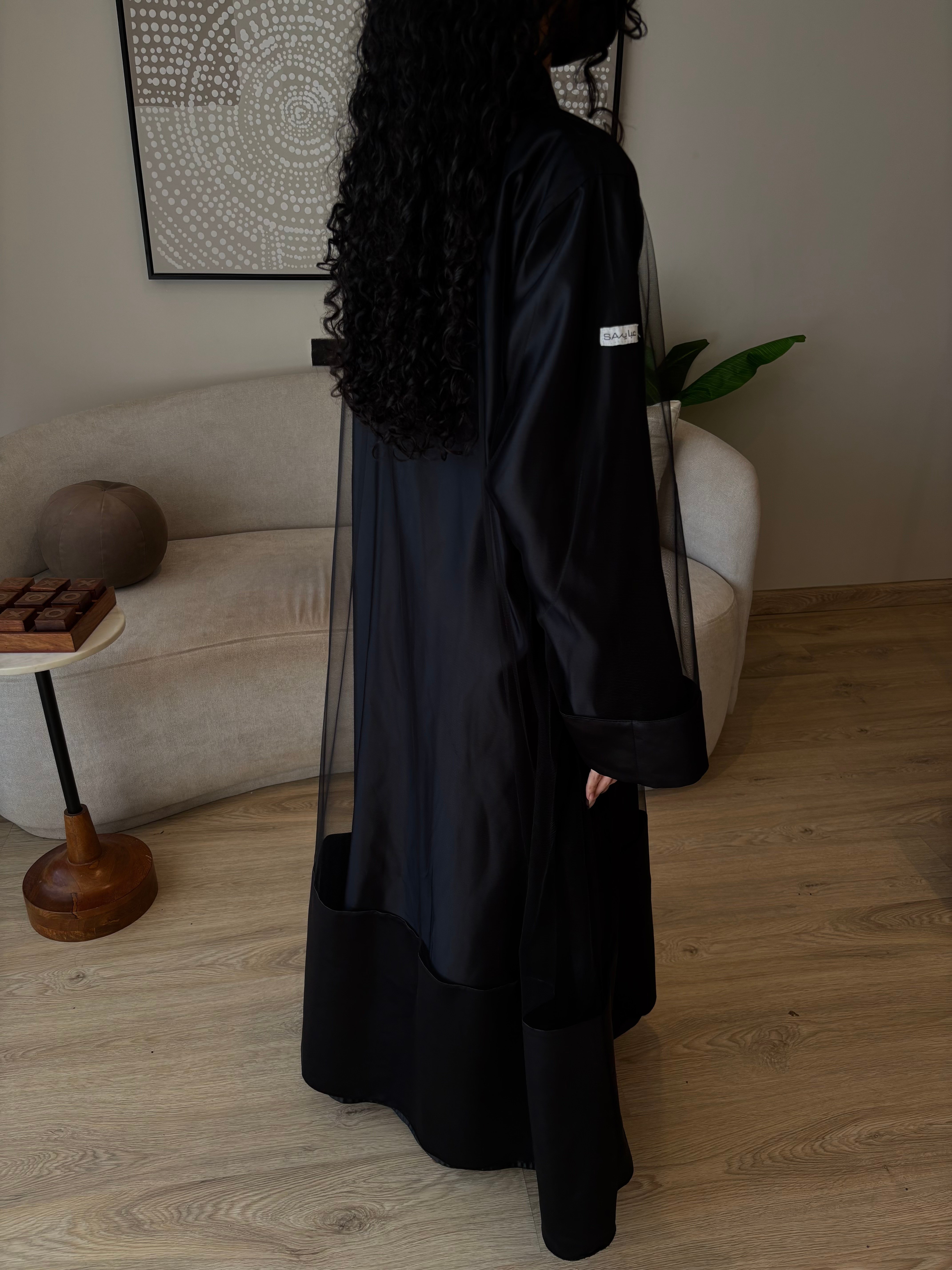 نوع القماش: قطعتين تل أسود فرنسي + تفتة واقف أسود